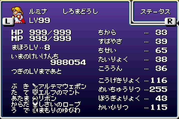 また、白魔道士の知性もLV99で60台止まり。