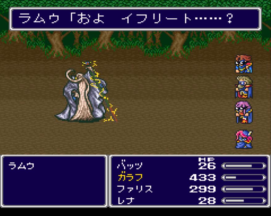 町を出たところにある森では、突然ラムウと出会い、戦闘になった。