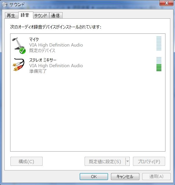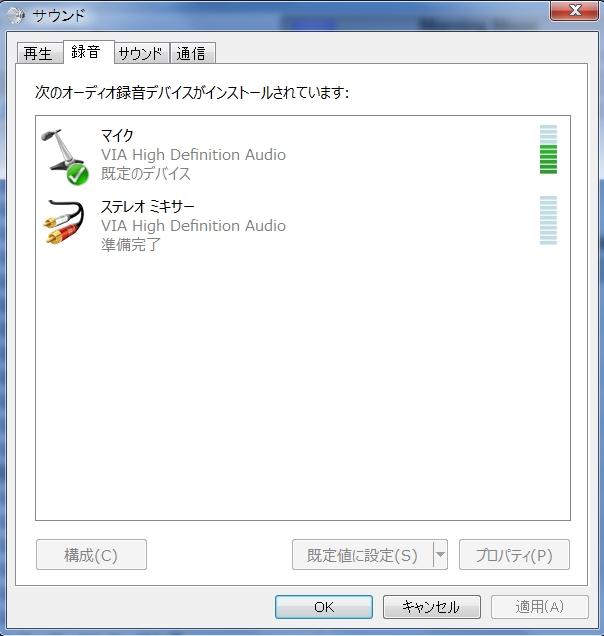 サウンドプロパティの録音タブで録音に使う「既定のデバイス」は、