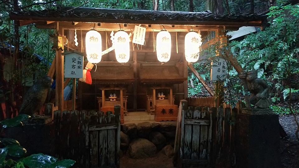 電球色というのか、ほのかなオレンジ色にあたたかく照らされた拝殿たち。
