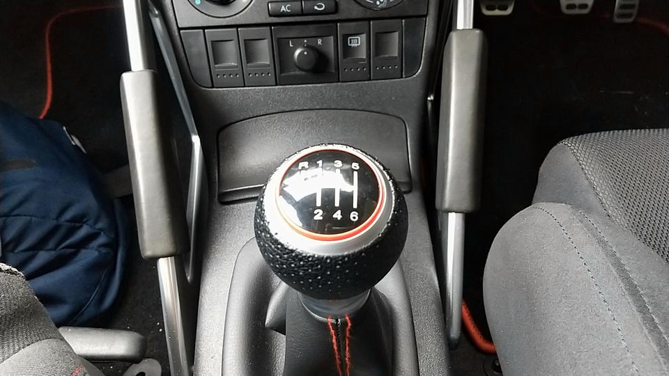 シフトパターンは、1〜6速は通常のH型だが、リバース(バック)は左上にある。