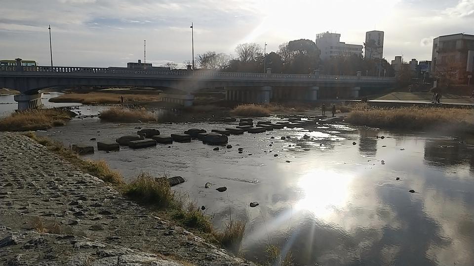 冬の寒い昼下がり、風のない日の鴨川の水面に映る、もうひとつの太陽。