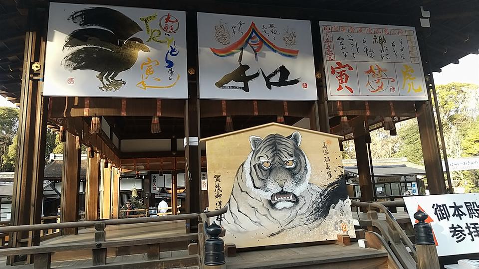 本殿の入口を、今年の干支である虎が描かれた大きな絵馬と