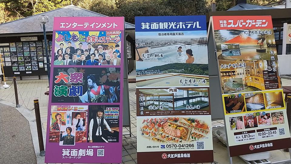 ( 2023/02/12 ) [2023/02/12] 箕面温泉スパーガーデンに遊びに行ってきました! ある日の冬、私は大阪府箕面(みのお)市にある 「大江戸温泉物語 箕面温泉スパーガーデン」に行ってきた。 場所はとてもわかりやすく、阪急電車「箕面」駅を降りると 山のほうに大きな建物とエレベーターが見えた。 そこと、その前に立ち寄った箕面公園の日帰り旅行のレポートである。 平日。天気はだいたい晴れ。