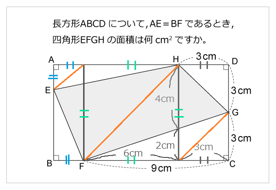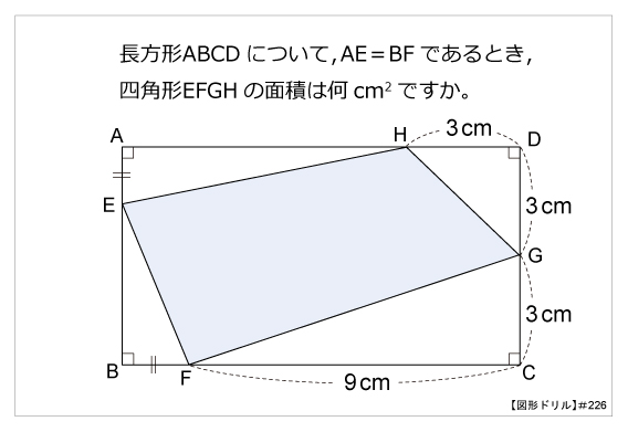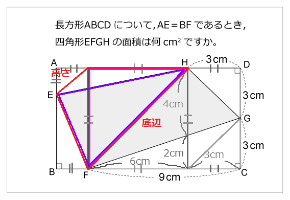 ( 2023/12/10 〜 2023/12/30 ) [2023/12/10] 四角形の中の四角形の面積 何のことかって? それはね、外接円・内接円ならぬ「内接四角形」といったところかな。 簡単に図形を描いてみると、こんな感じ。 ![]() 下手クソ、だって? ごもっとも。 詳しくは、下記のサイト様を御覧いただければよろし。 長方形の中の四角形 (算数星人のWEB問題集) さーて、この図形。 まずは私、この記事を立ててから30分ほど一生懸命答えを考えてみたんだけど・・・ サァーーー・・・・・ッパリわからん!! かった。 とりあえず回答のヒントは出ていたので、それをもとに解いてみた。 勝手ながらも画像をお借りさせていただいて、と・・・ ![]() 長方形の中の四角形とくれば、まず長方形の面積を求めて、 それから当の四角形の周辺にある4つの三角形の面積を引きたくなる。 ここでは三角形を「△」、四角形を「□」、面積を「S」と表記させていただく。 求めるものは、 S(EFGH)=S(ABCD)−{S(AEH)+S(BEF)+S(CFG)+S(DGH)} このうち、△CFGと△DGHの面積はそれぞれ、13.5cm^2、4.5cm^2 とすぐ出るが、 他は辺AE=BFということがわかるだけで、辺AHとBEの長さがわからない・・・。 そこで、解答のヒントとして、三角形に分ければいいと書いてあった。 ![]() で、それを手がかりに自分なりに図形に線をカラーで入れてみると・・・ まず、FとHから垂直線を引く。青とピンクの縦の直線ね。 すると、辺CFのうち、Hの真下からFにかけての辺の長さは3cmとなり、残りが6cmとなる。 青とピンクの線に挟まれた四角形は、6cm四方の正方形。 辺CFの全長9cmのうち、6cm地点での斜辺への直線の長さは、2cm。9:6=3:2。 ![]() 地形全体に出来上がった3つの四角形の特定の箇所に、 それぞれ左上方向にオレンジ色で対角線を描いてみた。 真ん中のやつは正方形だからそのまま書いてよし。 右のやつは、2辺が同じ長さ(3cm)だから、これもよし。 そして左のやつは、辺AEとその上側の辺が同じ長さだから、対角線を引ける。 これら3本の対角線は、お互いに平行である。 ![]() ここで三角形の面積を利用する。 底辺 x 高さ ÷ 2 ![]() 赤い枠の台形で考えると、ちょうど「ピンクの三角形」と「紫の三角形」が同じ面積になる。 この問題における面積を求められるほうは、紫の三角形のほう。 三角比というか、ピタゴラスの定理(三平方の定理) (三角形の長辺の2乗=他の2辺の2乗を足したもの)を用いて 底辺と高さ、それぞれの長さを計算してもいいけど、 ここではもっと簡単な方法がある。 上の画像でいう、「ピンクの三角形」と「紫の三角形」 すぐに面積を求められるのは、ピンクのほう。 6cm四方の正方形のちょうど半分なので、6x6÷2=18 よって、紫の三角形も18cm^2である。 なお、赤枠の台形の反対側にも、もう半分同じような形の図形があるが、 こちらは辺の長さが決まっているので面積を求めやすい。 □DCFHの面積は、(9+3)x6÷2=36 △CFGと△DGHの面積はそれぞれ、13.5cm^2、4.5cm^2。 よって、この三角形の部分の面積は、36−13.5−4.5=18cm^2である。 そして最後にこれら2つの面積を足し合わせれば・・・ 18+18=36cm^2 36平方センチメートルが答えだ! ・・・・・と、この問題を解き始めてからここに至るまで、 解説用の図形の作成も含めて、実際に2時間近くもかかってしまった。。マヂで。 なお、これとは別に円の外側にある「外接四角形」や、 それとは反対に円の内側にある「内接四角形」というものもあるみたいだけど・・・ パス!! 無理だ。。 正直なところ、私は数学が苦手だったりする・・・。 まあアレだ、たまには頭の体操ってやつをしたかっただけさ! (逃げる) [2023/12/12] 12月=師走。だけど先生は走っていない? 12月は、日本では「師走」(しわす)ともいう。和風月名(わふうげつめい)というもの。 他の11ヶ月は、1月から11月まで順に・・・ 睦月(むつき)、如月(きさらぎ)、弥生(やよい)、卯月(うづき)、皐月(さつき)、水無月(みなづき)、 文月(ふみづき)、葉月(はづき)、長月(ながつき)、神無月(かんなづき)、霜月(しもつき) ・・・と、3月の弥生を除けば「月」と付いているのに、 1年の最後の月である12月だけは「師走」と、ある種の異彩を放っている。 師匠が走ると書いて、師走。なんで先生が走るのか? ググってみたところ、答えはこうであるらしい。 師走/しわす (語源由来辞典) 元ネタは、平安末期の『色葉字類抄』より。 師走は現在の当て字であり、本来は「師馳す」または「四極(しはつ)」と書いたのだそうな。 まあ、その時代に学校は存在しなかったわけだから、当然先生も存在しない。 けれど、お寺はあったので、お坊さんはいた。 よって、師走だけど先生は走っていない、と。 なるほど、そういうことか。 [2023/12/15] 一撃必殺の言葉となりうる「よかった」 物事のよしあし。「良い」の反対は「悪い」。だから、「良かった」の反対は「悪かった」。 これは言わずと知れたこと。 しかし、「よかった」という言葉は、状況によっては相手にトドメを刺す必殺の一言になることがある。 私など、特にジ
