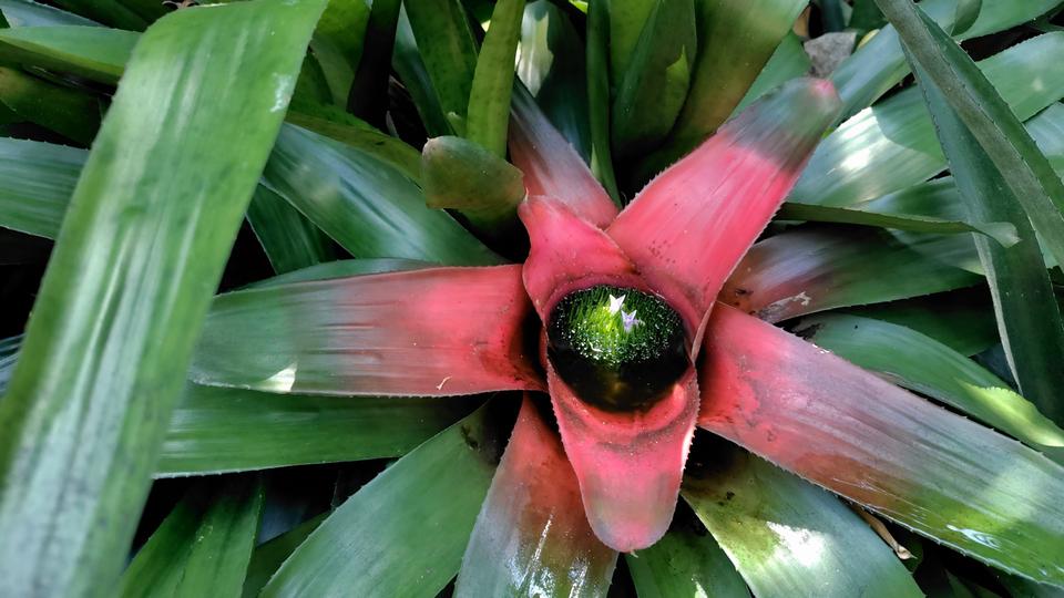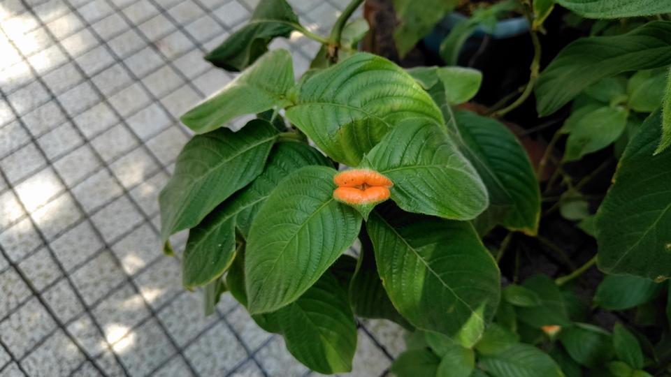熱帯エリアでは、2枚の葉が唇のような形と赤色に染まっている植物に出会った。